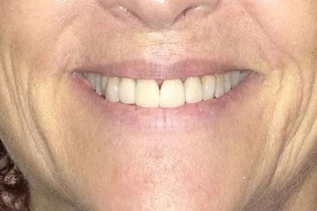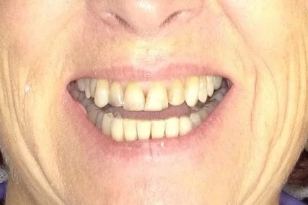 Uneven teeth, smile line, and gum line with broken old restorations. Teeth restored to have smile that is youthful.
